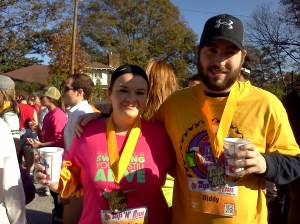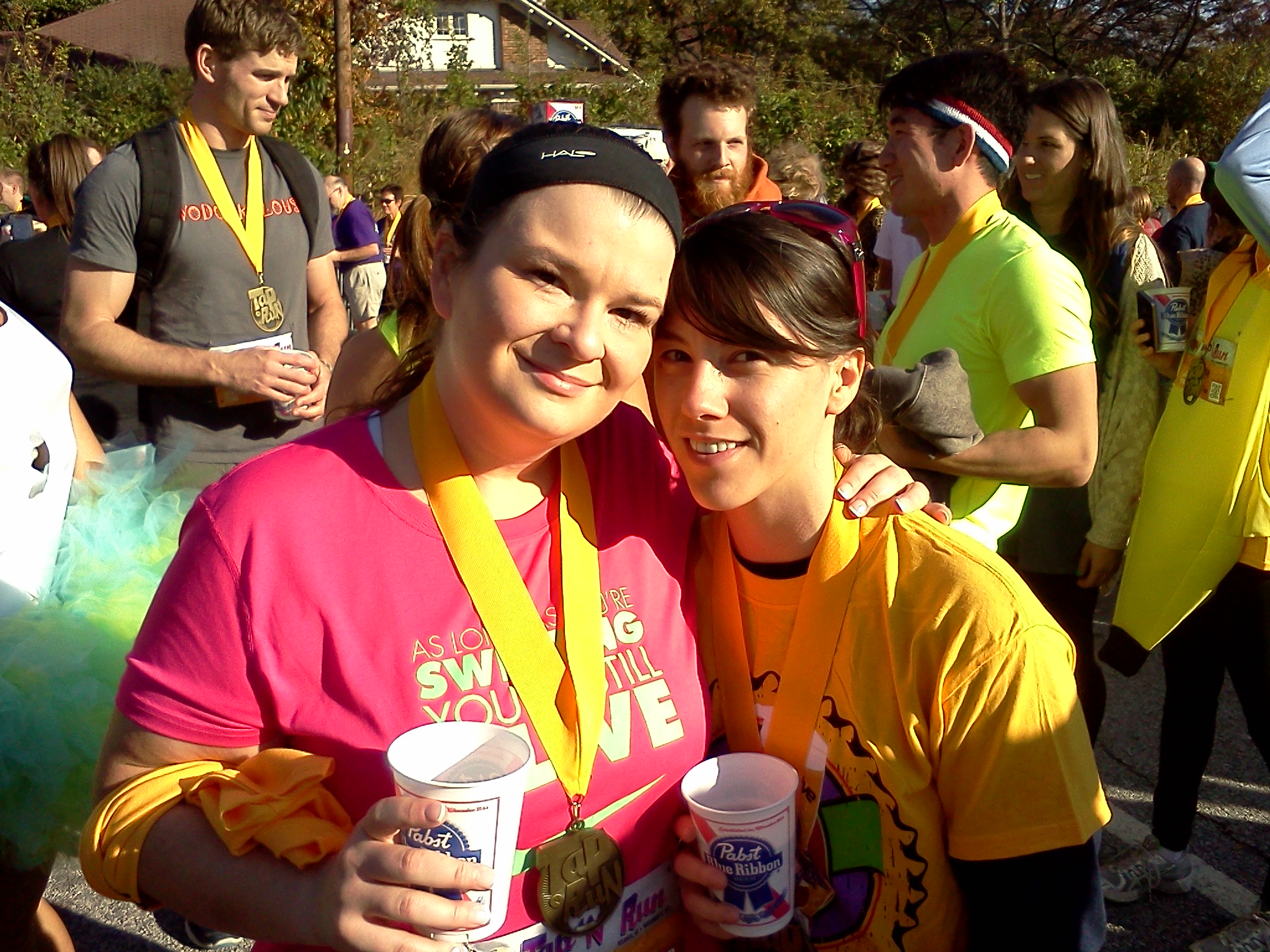 Have any of you heard of this glorious thing called hashing? Apparently it’s when you do races/run and incorporate drinking. On Saturday I partook in my first run that involved alcohol: the Atlanta Tap N Run. I ran, mostly walked and occasionally jogged this race with my husband and my best friend and we had a blast. There were a ton of costumes and crazy people, but it was all and all, amazing. You get to put an alias on your bib, mine read “Danichan” (which is an affectionate nickname my husband calls me) and his says, “Diddy” well, because I call him Diddy/Daddy and my bff’s said “A Town Runs” because she’s clearly inappropriate. We plan on doing this again next year and maybe even doing some crazy costumes, too! Afterall, you get a kick ass shirt and even a bottle open medal for finishing. Speaking of the shirt – we picked our shirts up before the race. My husband holds up his Large and I think to myself, “That looks big. I’ll take a medium!” with a whole lot of temporary excitement. Hell, I used to wear a XXL – so a medium seems too far fetched. The longer I hold my size medium the more fleeting my excitement gets. I hold it up to myself and think, “Definitely won’t fit.” My bff and husband just put theirs on and run in it. Seems simple enough. I, on the other hand was way too paranoid by this point and just knew that my medium wouldn’t fit. I suddenly had this vision that it’d be some horribly awkward moment where my arms were up in the air and I look like the incredible hulk, but chubby not muscular, my new shirt ripping and everyone is trying to pull it off of me and salvage what was left of it. Oh god, it was a horrible flashing moment. So, I just tied the shirt around my arm like a tourniquet (which you can see in the pictures) and saved myself the potential nightmare. After the race I sprinted to our car to try on my medium shirt – only allowing my husband to witness the potential embarrassment and assist me when I’m flailing my stuck arms around like an idiot, but by god – it fit. A medium fit…