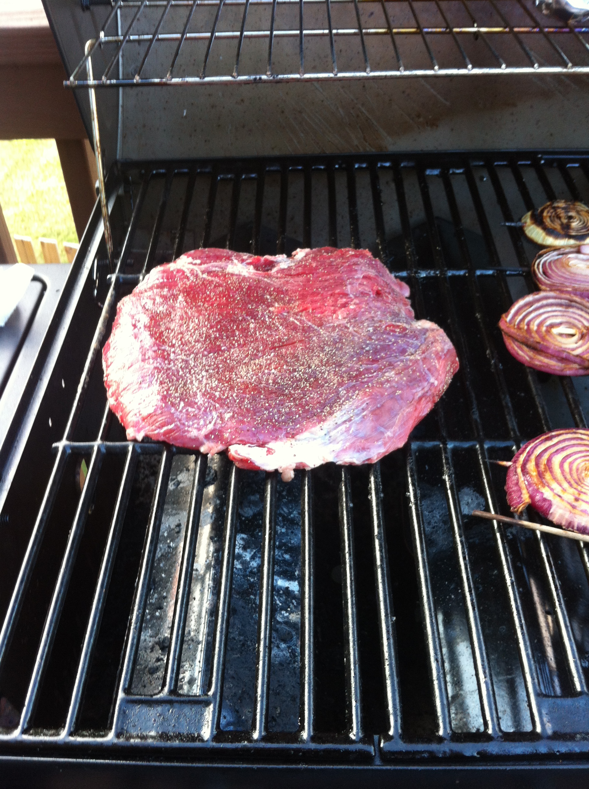 So, it’s been about 30 minutes since your onions have been on the grill…which means it’s about time to throw that steak on. You will put your steak on and cook for about 7 minutes on each side for a good medium rare…your grill must be on medium heat though! If you’re rocking a hot grill you’ll have pucks! My grill was a titch warmer than I wanted so I grilled 6 minutes on each side and rotated for some fancy hatch marks every 3. That is totally not necessary. I’m just a fancy bitch.