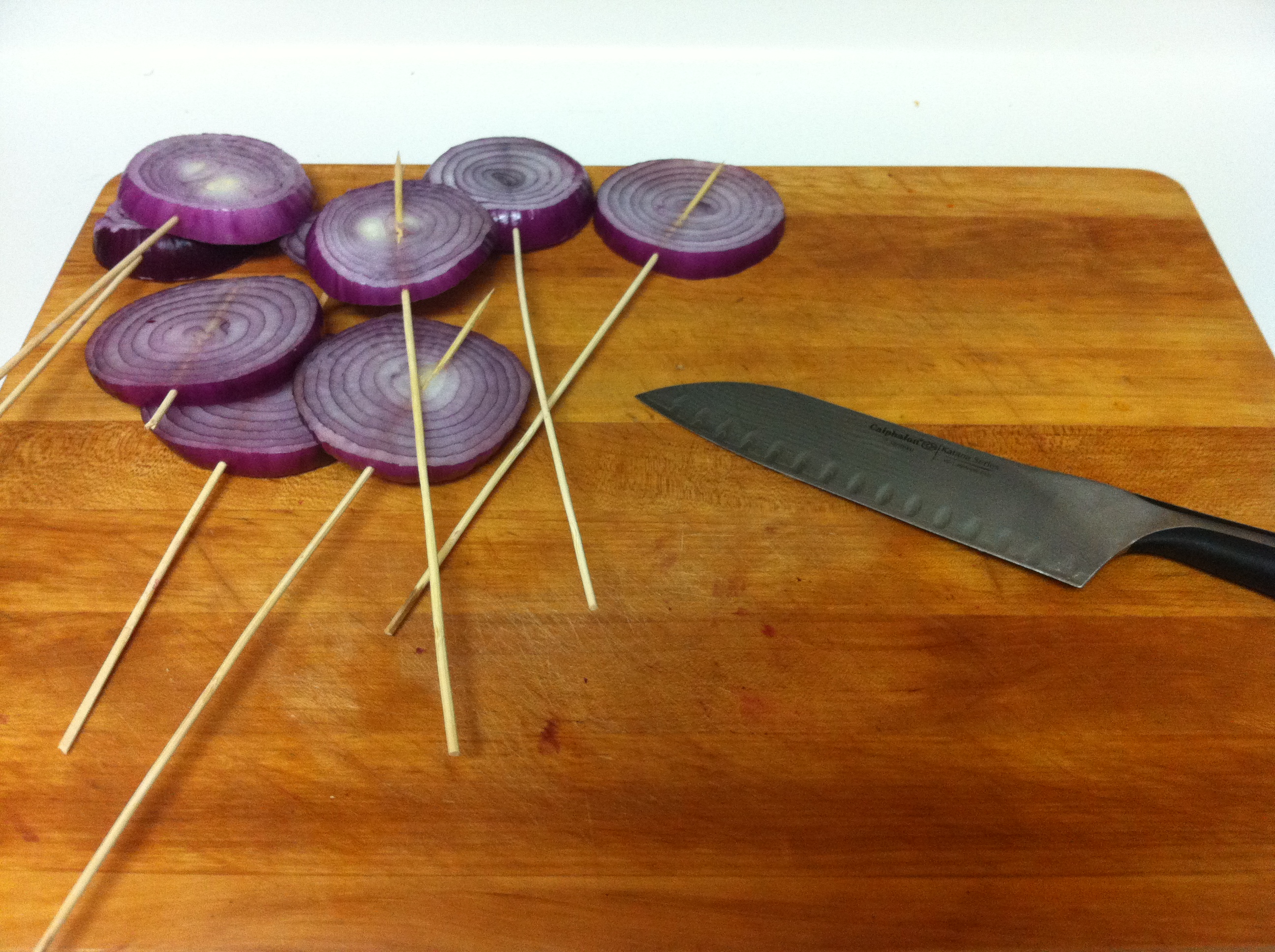 Once you are properly sliced get those suckers on some 12-Inch Long Stainless Steel Skewers. Don’t be like me and use wood – you will see why shortly. Think onion lollipops. Some sneaky vidalia’s showed up to the scene so I let them in, too.