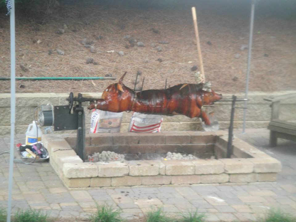 The roast is on Sunday, but a crew of us start prepping Saturday. We stay up over night and sit by the spit and roast the pig. We ice the beer, set up the dunk tank, the water slide, made the food, etc. etc.