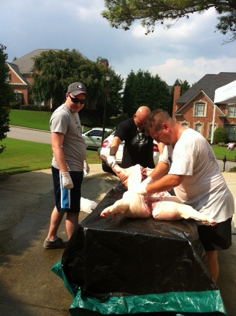 Anyhow! I digress, this big pig roast is essentially a weekend of fun and festivities. I only have a very few pictures currently, but will surely post more as they come in! 🙂 The name changes every year, and this year I came up with “Silence of the Hams” BAHAHAHAHAH – I’m so funny. We have official shirts made, coozies given out, free beer, amazing food (we’re a family of foodies), dunk tank, water slides, etc. for all to enjoy. They only thing we ask anyone to do is donate what their heart desires. Sierra Nevada (beer) generously supplied the beer this year, Kroger gave some money, etc. etc. It’s pretty incredible.