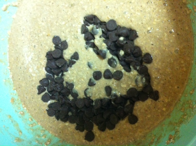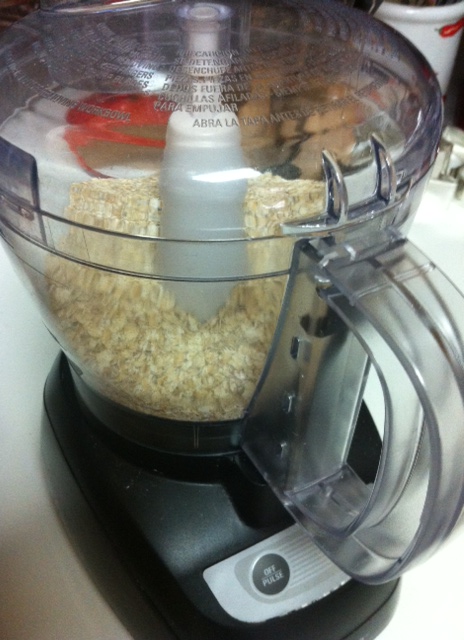 Aight – pulse your oatmeal in a food processor about 5-6 times. Just break it down some. Nothing too fancy. You’re just making kinda sorta coarse flour. It adds a little texture and yumminess. I’m sure if you didnt own a food processor and didn’t want to do it by hand your world would not end and you could just throw the oatmeal in. I won’t tell anyone.