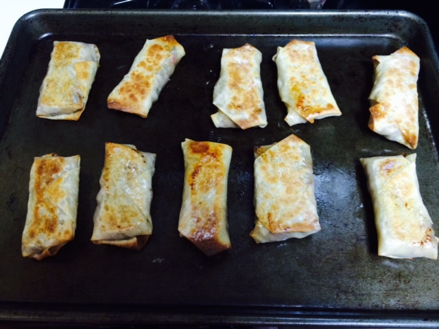 If you’ve never wrapped an egg roll here ya go! PS – the water works as glue, so just dip your finger/brush in the water and trace the outer perimeter of the wrapper.