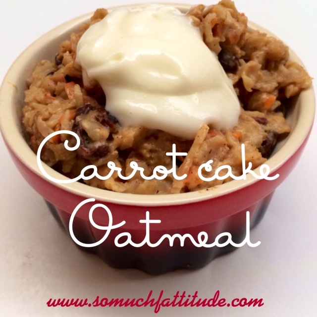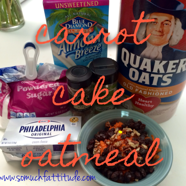 I love oatmeal. I love oatmeal cream pies, I love oatmeal cookies, I love based bread, I just really effing love oatmeal. I also really love carrot cake. Carrot cake with a cream cheese frosting. A moist, creamy, spicy, yummy carrot cake. So, I made oatmeal and carrot cake have a baby. I am most pleased with the results. This is perfect right before hitting the gym.