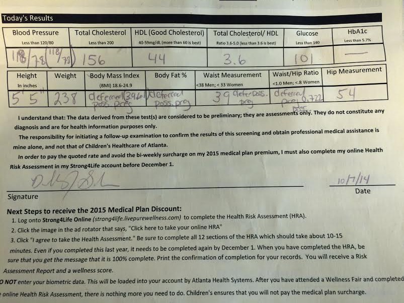 My blood pressure is definitely higher than it used to be, but still good and normal. My cholesterol is all in the normal range, though personally, I’d like to see my good cholesterol get a little higher. Now that I’m training again, that should help fix that. My glucose is great. No issues with any diabetes looming. They wanted me to do the whole fat measurement thing where you hold the device and squeeze, but I refused. She said they don’t do it with women that are pregnant or people with pacemakers. I told her I’m trying to get pregnant, could be pregnant and am on fertility drugs so I’d be damned if I’m doing anything that might jeopardize it. My hip to waist ratio states that I’m at low risk for heart disease, stroke, etc. So, all my numbers are fine. Nothing to be worried about. Totally normal, yet I still get the, “Hey, fat shit – lose weight and you’ll be a rockstar” speech.