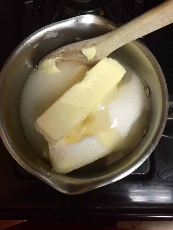 2. Now, put the sugar, corn syrup, butter and water in a HEAVY bottom 4qt and clip your candy thermometer to the side. Seriously use one. There are different states of melted sugar (thread, hard ball, soft crack, hard crack, etc.) We are taking this up to 310 degrees. If you are absolutely determined to do this without a candy thermometer because you are a candy bad-ass then try to get it to the color of the skin on the almond and don’t be all pissy when it doesn’t come out as good as you thought it should.